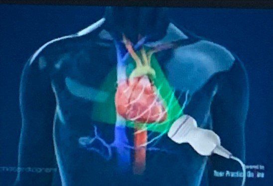 The first type is the Transthoracic Echocardiogram (TTE). This is performed while lying flat on your back. There's a machine with a screen and a handheld probe.
