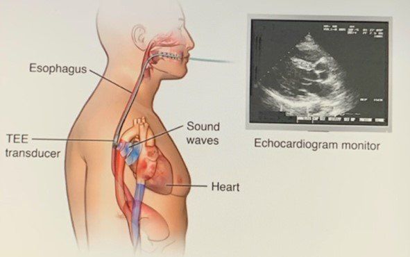 The transesophageal echocardiogram is done while laying on your side. A small probe is guided down your throat by the cardiologist along with a technician.